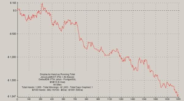 5/10 ist der allergrößte witz+fischteich ever. gegner callen 4bets cold mit gutshots und treffen (heute) jedes mal. jeder 2-outer kommt an. das tut schon weh....... 2000$ down. das sind 2/5 meiner ganzen bankroll.... sick, einfach nur sick.