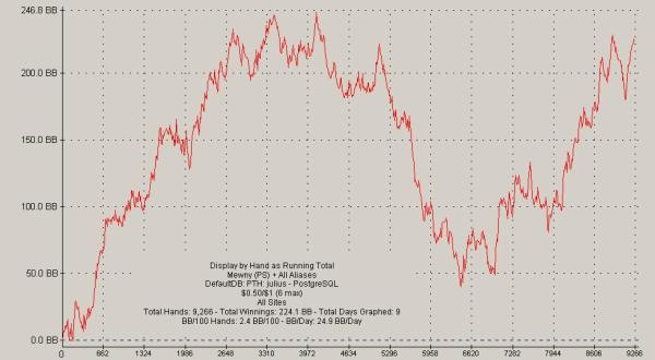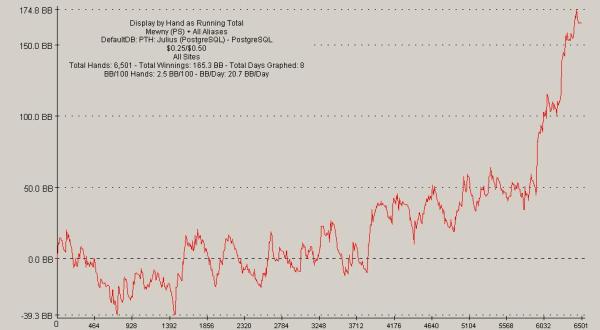 nun hoffe ich natürlich dass das möglichst noch eine weile so weitergeht und ich bald die 12k hands und in der folge natürlich auch die 300$ für 0,5/1$ zusammen habe und aufsteigen kann. ich fühle derzeit richtig wie sich mein spiel verbessert und bin auch täglich am hände posten bzw lesen, und habe dabei immer mehr erfolgserlebnisse insofern, dass fast alle meine hände als gut gespielt bewertet wurden ;). mein spiel ist auch auf jeden fall viel flexibler geworden, ich spiele nun ausschließlich nach orc und habe einige effektive neue lines, vor allem in position, in mein repertoire aufgenommen und verinnerlicht. was es sonst noch zu berichten gibt: habe mit mcmoe, einem 26-jährigen studenten, eine kleine trainigsgruppe gebildet, wir coachen uns gegenseitig, diskutieren in skype und bewerten hände zusammen ;) hat mir auf jeden fall schon viel gebracht! aktueller zielfortschritt: [ ] 12k hands (6,5k atm) mit mindestens 2.5bb/100 (2,54 atm) meine momentane br liegt bei 253$. hier noch der 0.25/0.5 alltime graph: ![]() ... link (0 Kommentare) ... comment Donnerstag, 8. November 2007