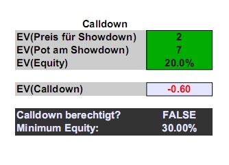 meine bankroll beträgt nun übrigens 300$, doch ich werde die noch fehlenden 1k hände bis zum erreichen meines etappenziels auf jeden fall zuendespielen, um dann gestärkt auf 0,5/1 aufzusteigen. hier der graph zu 0,25/0,5: ![]() vor allem mit der theorie beschäftige ich mich im moment sehr verstärkt, grade habe ich den artikel zum thema "downcalls" durchgearbeitet, an einem zum thema "equity" sitze ich jetzt grade. um ein gefühl für das im downcall-artikel gelernte zu entwickeln, habe ich ein kleines excel-programm entwickelt, das verschiedene sachen berechnen kann. hier ein kleiner screenshot: ![]() in die grünen felder kann man seine daten eintragen, sofern bekannt, unten wird dann angezeigt ob der call +EV wäre und welche equity man hier mindestens bräuchte. bei nachfrage kann ich das programm vll auch weitergeben, ich analysiere zuletzt alle meine downcall-hands damit, weil es einfach supernützlich ist :) was ich mir übrigens für die zukunft des blogs in formaler hinsicht vorgenommen habe, ist: 1) den link im ps.de forum zu publizieren, um den austausch mit anderen leuten über mein spiel anzuregen und 2) ab jetzt mindestens alle 2 tage eine interessante hand aus meinen sessions rauszusuchen und mathematisch komplett auseinanderzunehmen und zu analysieren. ich hoffe, dadurch können ein paar leute vll fehler in meinen denkweisen aufspüren und mich darauf aufmerksam machen, und außerdem hilft es mir auch bei der eigenen verbesserung und sicherheit. so far! ... link (0 Kommentare) ... comment Donnerstag, 22. November 2007