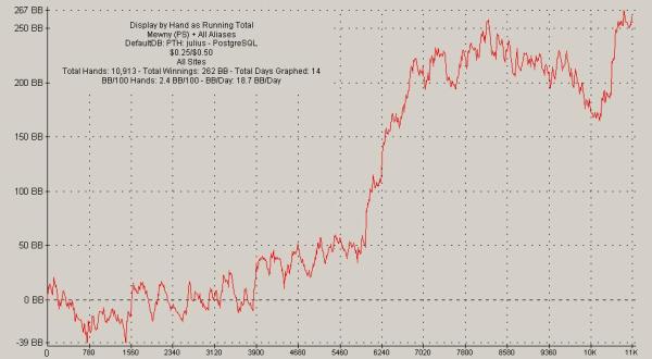 die 12.000 hände sind bald geschafft und auf eine kurze up-phase folgte ein kleiner, aber heftiger 75bb-downswing, wo ich zum teil unterirdische 30% won at showdown-werte hatte. auf jeden fall kann ich schonmal sagen, dass das neue limit sehr viel swingiger ist, als das vorige, obwohl man rein logisch gesehen ja eher vom gegenteil ausgehen würde.