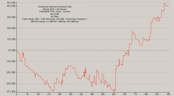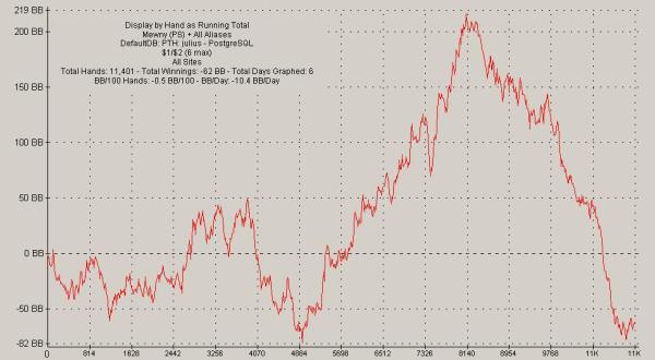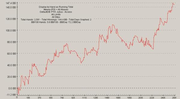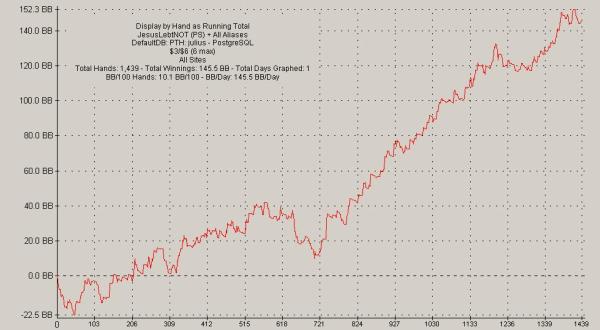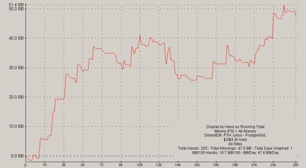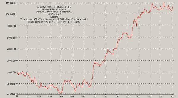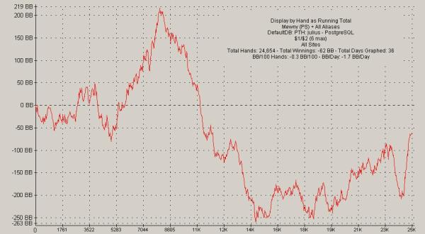 habe heute eine kleine session gespielt mit 1k händen. zuerst sahs nicht sehr gut aus, steckte unter anderem 3 mal mit kings in nem riesenpot und wurde dann am river noch gecracked. als dann irgendwann noch 2 tische aufgemacht wurden und ich 6tablen konnte, gings wieder ganz gut bergauf.